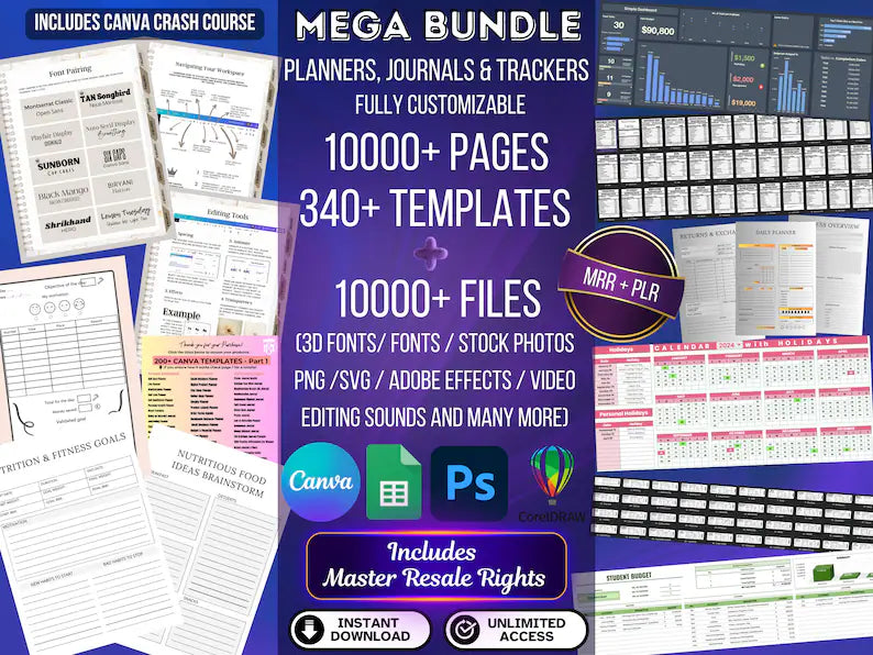 20,000+ PLR Files: Planners, Journals & Templates (+ 340 Bonus Trackers, Printable, 6500 Fonts, Canva Course,& More)