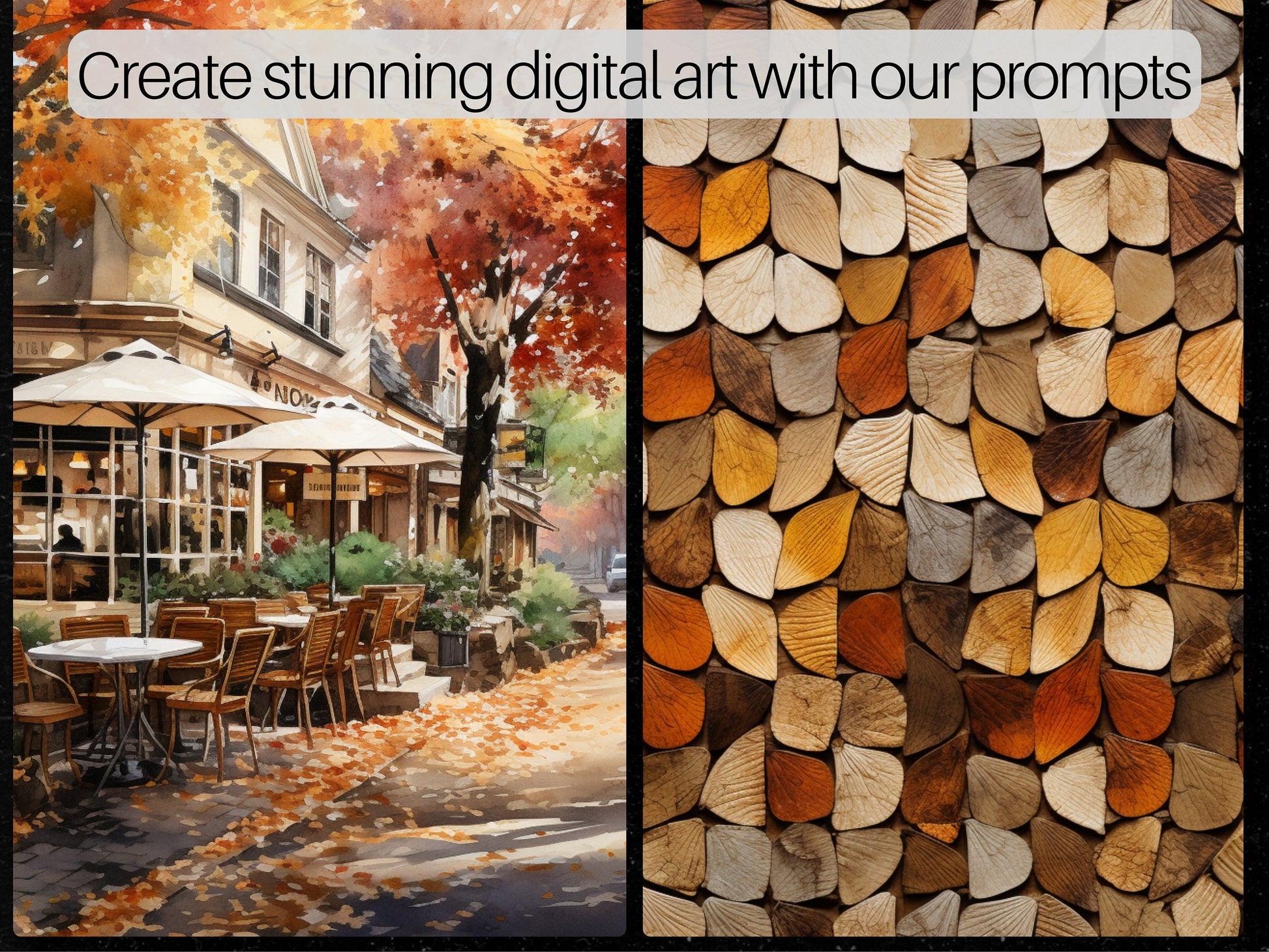 Ranging across 35 diverse categories of autumn-inspired art, this comprehensive pack includes prompts designed to emulate the signature styles of famous artists such as Van Gogh, Monet, and Bob Ross. So whether you're into Autumnal Landscapes, Fall Wildlife, Harvest Time, or more abstract styles like Cubist Autumn and Art Nouveau Autumn, we've got you covered.