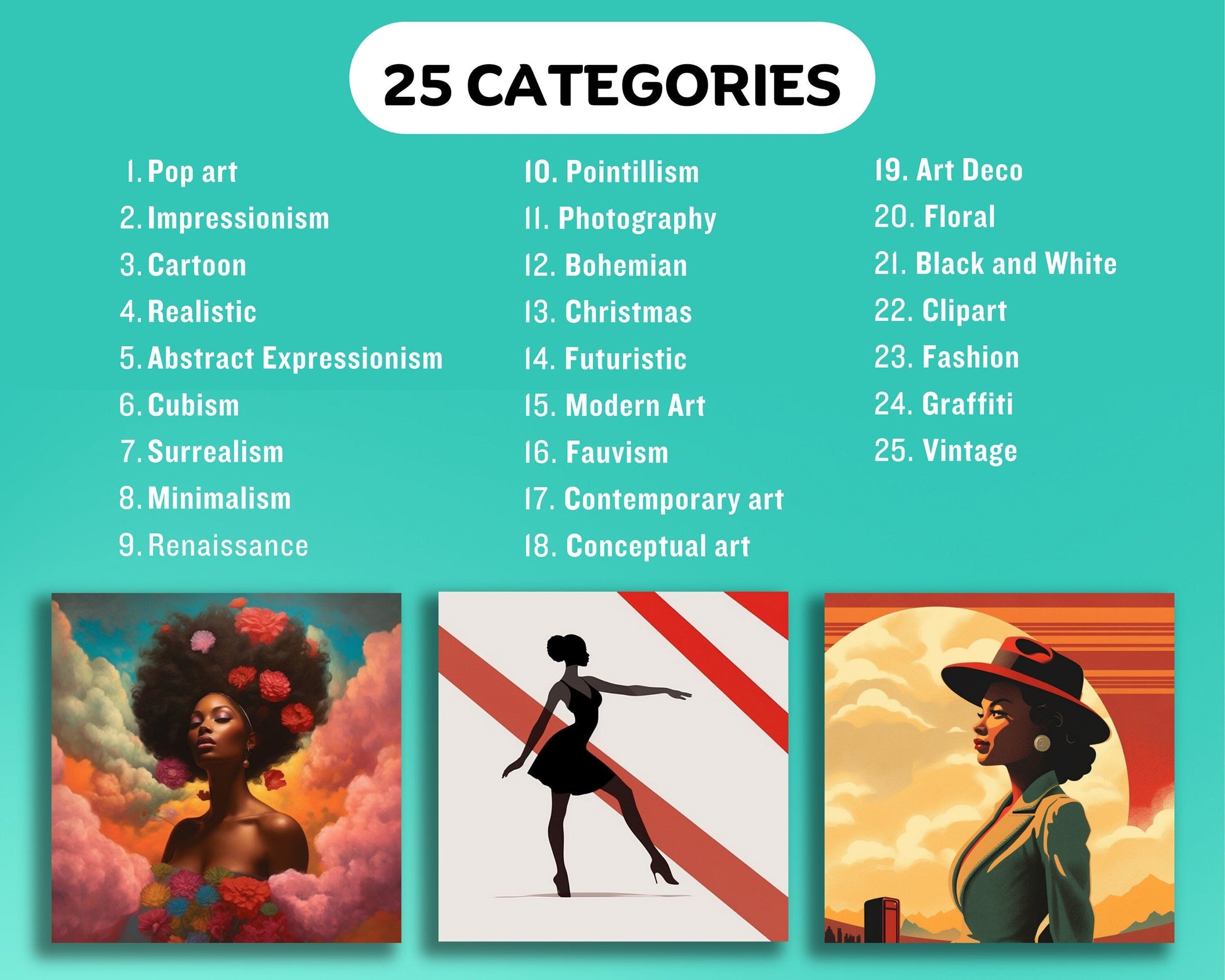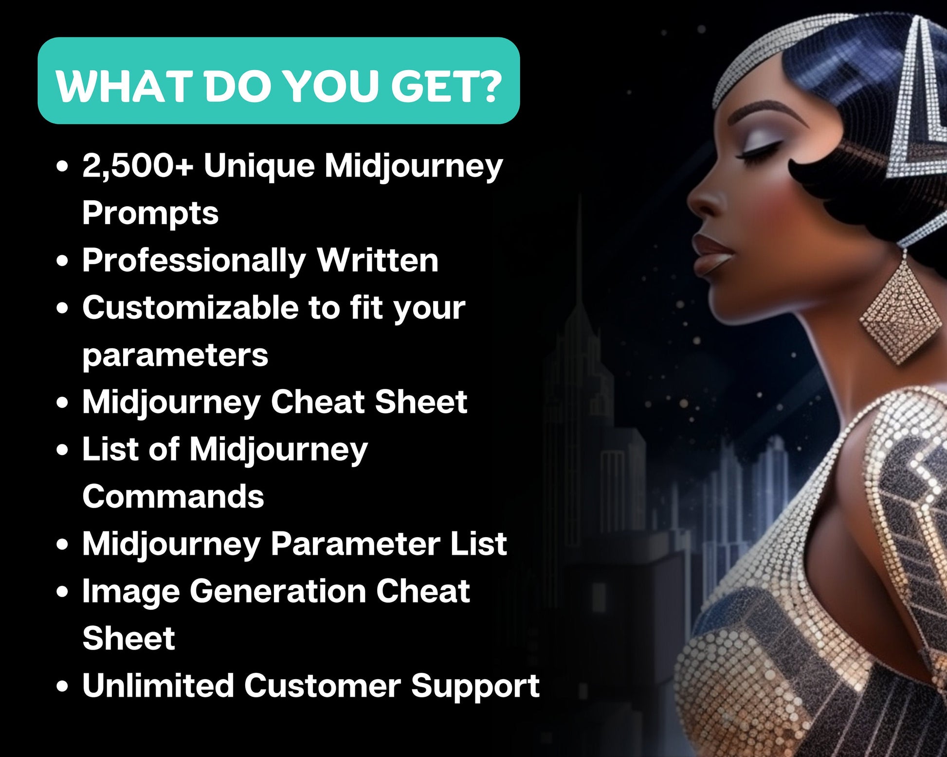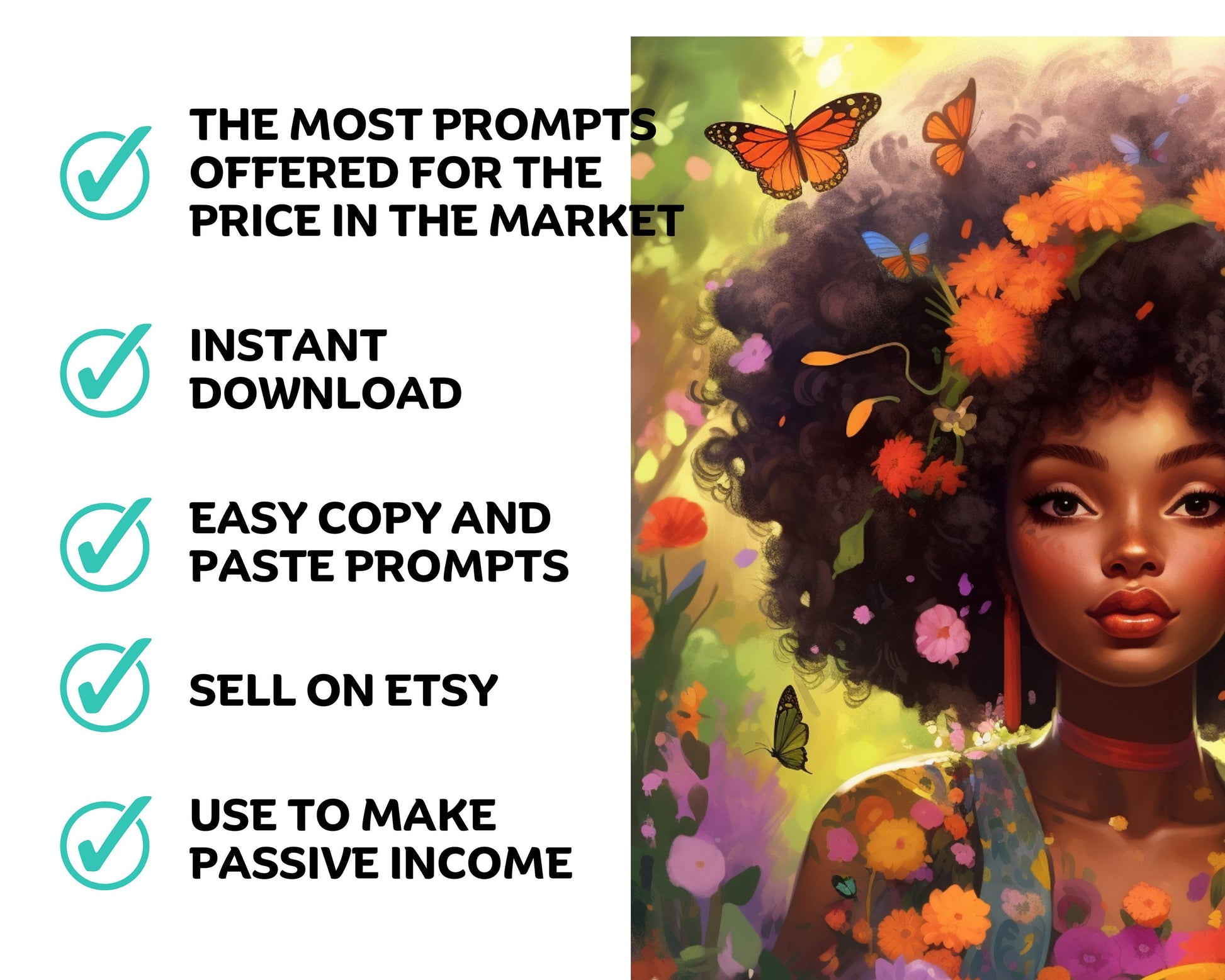 Get this 2500+ Midjourney Prompts to help you create unimaginable AI art Digital Black Female designs so you can speed up your design, lead times and make passive income by selling them on Etsy.